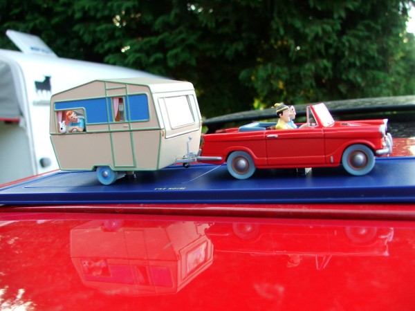 En la tienda del museo, tienen todo tipo de cosas relacionadas con Tintín, pero a unos precios muy altos; por ejemplo tienen todos los vehículos que aparecen en los comics, perfectamente reproducidos; en La Isla Negra, aparece Tintín dentro de una caravana......y no me resistí a comprarlo. Según la documentación que te dan con la compra, la caravana es una Eccles G.T. 305 y el coche un Trimph Herald 1200